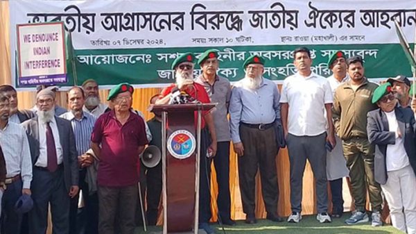 সমাবেশে সাবেক সেনা কর্মকর্তারা ভারতীয় আগ্রাসন ও অপপ্রচারের সমালোচনা করেন।