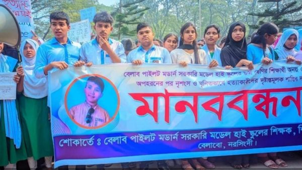 নরসিংদীর বেলাবতে অষ্টম শ্রেণীর শিক্ষার্থী অনয় হত্যাকারীদের বিচারের দাবীতে শিক্ষার্থী, শিক্ষক, এলাকাবাসী মানববন্ধন করা হয়েছে।