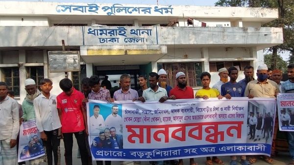 সোমবার বিকাল ৪ টার দিকে ধামরাই থানার সামনে আওয়ামী লীগের সহযোগী খোকন মোল্লা ওরফে কানা খোকন, হারেজ, আসাদুল গংদের শাস্তির দাবিতে কুল্লা ইউনিয়নের বড়কুশিয়ারা সহ অত্র এলাকাবাসী একত্রিত হয়ে মানববন্ধন করেন।