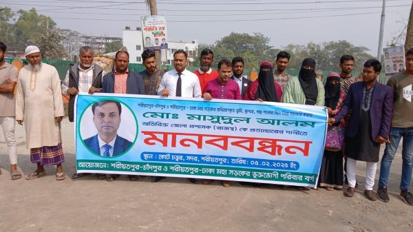 শরীয়তপুরে ভূমি অধিগ্রণে অনিয়ম হয়রানির অভিযোগে অতিরিক্ত জেলা প্রশাসকের প্রত্যাহারের দাবিতে মানববন্ধন