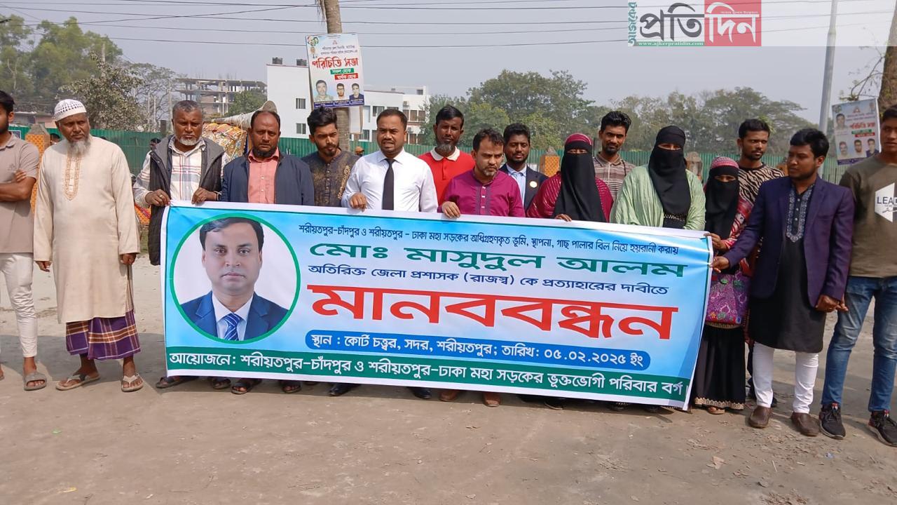 শরীয়তপুরে ভূমি অধিগ্রণে অনিয়ম হয়রানির অভিযোগে অতিরিক্ত জেলা প্রশাসকের প্রত্যাহারের দাবিতে মানববন্ধন