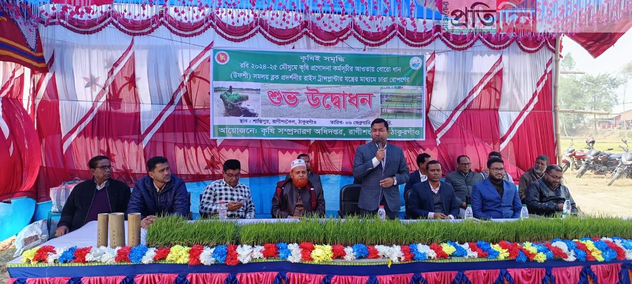 ঠাকুরগাঁওয়ের রাণীশংকৈলে,কৃষিই সমৃদ্ধি' এ স্লোগান সামনে রেখে কৃষি অধিদপ্তরের আয়োজনে রবি ২০২৪-২৫ মৌসুমে কৃষি প্রণোদনা কর্মসূচীর আওতায় বোরো ধান (উফশী) সমলয় ব্লক প্রদর্শনীর রাইস ট্রান্সপ্লান্টার যন্ত্রের মাধ্যমে ৫০ একর জমিতে চারা রোপণের উদ্বোধন করা হয়েছে।