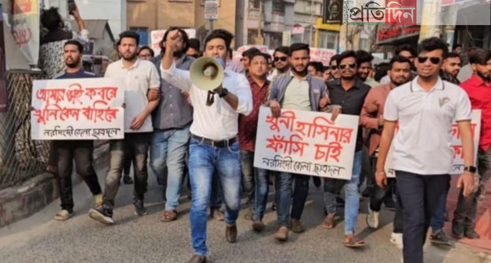 নরসিংদীতে স্বৈরাচার শেখ হাসিনা সহ তার দোসরদের ফাঁসির দাবিতে বিক্ষোভ মিছিল করেছে নরসিংদী জেলা ছাত্রদল। সোমবার বিকেলে নরসিংদী জেলা ছাত্রদলের সিনিয়র যুগ্ম সম্পাদক জুবায়ের আহমেদ তুষারের নেতৃত্বে কয়েক শতাধিক ছাত্রদলের নেতাকর্মীরা এই বিক্ষোভ মিছিল করেন।