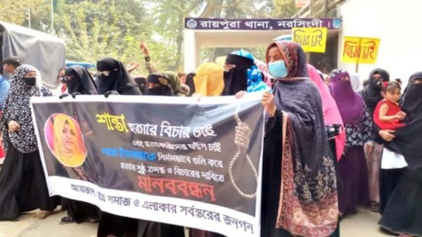 রোববার দুপুরে রায়পুরা পৌরসভা মাঠে এ মানববন্ধন করা হয়। পরে পৌরসভার সাবেক মেয়র আব্দুল কুদ্দুসের নেতৃত্বে একটি বিক্ষোভ মিছিল করা হয়। মিছিলটি রায়পুরা বাজার হয়ে বিভিন্ন সড়ক প্রদক্ষিণ শেষে রায়পুরা থানা প্রাঙ্গণে গিয়ে শেষ হয়। সেখানে থানা ঘেরাও করে অফিসার ইনচার্জের সামনে আসামী গ্রেপ্তারে ৪৮ ঘন্টার আল্টিমেটাম দেয় বিক্ষুব্ধ জনতা।