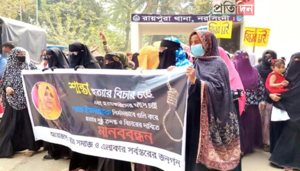নরসিংদীর রায়পুরায় গৃহবধূ হত্যাকারীদের গ্রেপ্তার দাবিতে মানববন্ধন