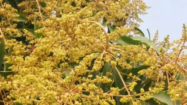 মাঘের হিমেল হাওয়ায় সবুজ পাতার ফাঁকে দোল খাচ্ছে এসব মুকুল। গাছের কচি শাখা-প্রশাখায় ফোটা ফুলগুলোর উপরে সূর্যের আলো পড়তেই চিকচিক করে উঠছে। বাগান গুলোর দিকে তাকালে আমের পাতা চোখে পড়েনা,শুধু চোখে পড়ে সোনালী মুকুলে ছেয়ে যাওয়া সুবিশাল হলুদের গালিচা। কুয়াশাচ্ছন্ন আবহাওয়া বিরাজ করায় কিছুটা ক্ষতির সম্মুখীন হচ্ছে নতুন মুকুলগুলো বলেও জানান আম চাষিরা। তাই মুকুলে রোগবালাইয়ের আক্রমন থেকে রক্ষা করতে স্থানীয় কৃষি বিভাগের পরামর্শ অনুযায়ী প্রয়োজনীয় ওষুধ স্প্রে করছেন তারা।