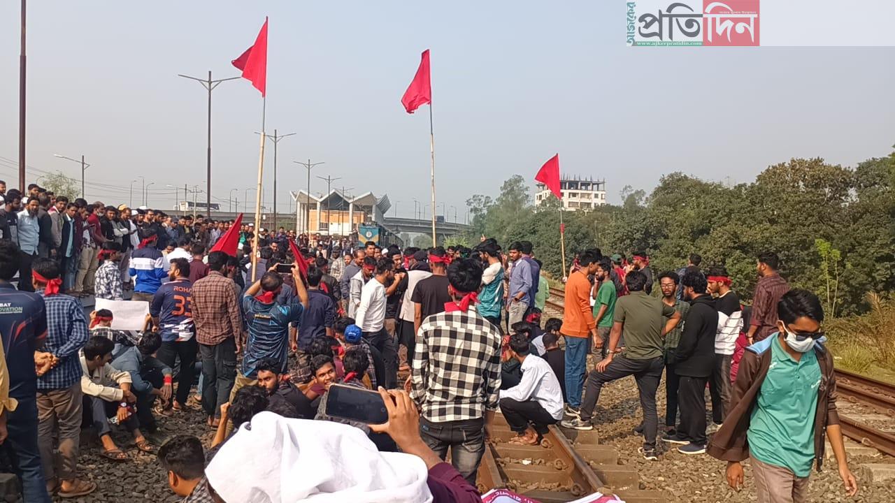 তারই অংশ হিসাবে সোমবার সকাল ৯ টা থেকে বিক্ষোভ শুরু করে শিক্ষার্থীরা। পরে তারা বিশ্ববিদ্যালয়ের প্রশাসনিক ভবনের সামনে থেকে মিছিল নিয়ে সোয়া ৯ টার দিয়ে কালিয়াকৈর হাইটেক রেল ষ্টেশন এলাকায় গিয়ে রেললাইন অবরোধ সৃষ্টি করে। সেখানে সিরাজগঞ্জ একপ্রেস ট্রেনটি আটকা পরে। আটকা পরা ট্রেনে বেশ কিছু অসুস্থ্য রোগি থাকায় তাদের স্বজনদের অনুরোধে শিক্ষার্থীরা পৌনে ১০ টার দিকে সিরাজগঞ্জ এক্সপ্রেস ট্রেনটি ছড়ে দেয়। তবে শিক্ষার্থীরা রেল লাইনের উপর বসে বিকেল ৩ টা পর্যন্ত অবরোধ সৃষ্টি করে রাখে। এতে দীর্ঘ সময়ের জন্য যাত্রীরা দুর্ভোগে পড়েন।