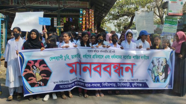 মুন্সীগঞ্জ প্রতিনিধি : মুন্সীগঞ্জের টঙ্গীবাড়ীতে দেশব্যাপী চুরি,ডাকাতি,ধর্ষণের প্রতিবাদে এবং ধর্ষকদের সর্বোচ্চ শাস্তির দাবিতে মানববন্ধন ও বিক্ষোভ মিছিল করেছে শিক্ষার্থীরা।