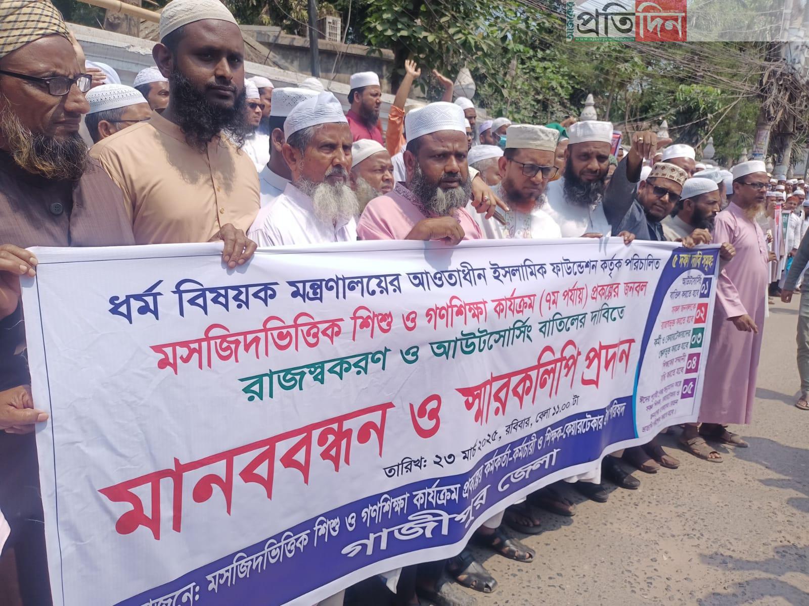 রোববার সকালে গাজীপুর জেলা প্রশাসক কার্যালয়ের সামনে রাজবাড়ী রোডে এ মানববন্ধন আয়োজন করা হয়। এতে জেলার পাঁচটি উপজেলার প্রায় সাড়ে তেরোশ শিক্ষক-শিক্ষিকা কর্মকর্তা-কর্মচারী ও তত্ত্বাবধায়কগণ অংশ নেন।