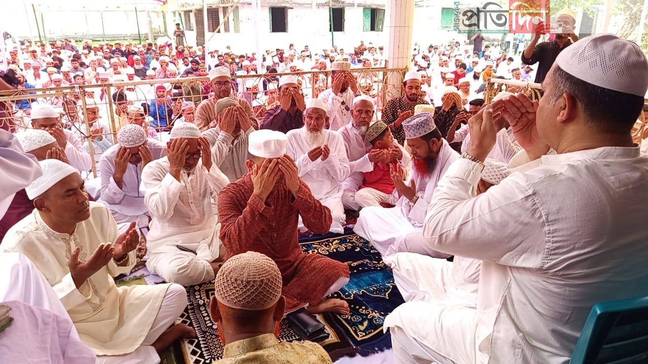 নামাজ শেষে দোয়ায় জুলাই-আগস্ট সহ গত ১৫ বছরে ফ্যাসিবাদ বিরোধী আন্দোলনে নিহত সকল শহীদ,ফিলিস্তিনের গাজায় নির্যাতিত নিরীহ মুসলিম, দেশনেত্রী বেগম খালেদা জিয়া ও বিএনপির ভারপ্রাপ্ত চেয়াম্যান তারেক রহমানের সুস্বাস্থ্য ও দীর্ঘায়ু কামনা করা হয়।