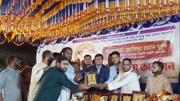 পরে কৃতি সহকারী অ্যাটর্নি জেনারেল মোস্তাফিজুরকে ক্রেস্ট ও ফুলেল শুভেচ্ছায় সংবর্ধনা দেওয়া হয়। শেষে স্থানীয় শিল্পীদের পরিবেশনায় এক মনোজ্ঞ সাংস্কৃতিক অনুষ্ঠানের আয়োজন করা হয়। অনুষ্ঠান সঞ্চালনা করেন উপ- সহকারী কৃষি অফিসার সাদেকুল ইসলাম।