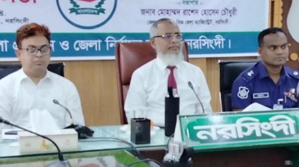জেলা প্রশাসক মোহাম্মদ রাশেদ হোসেন চৌধুরী সভাপতিত্বে এসময় উপস্থিত ছিলেন ঢাকার আঞ্চলিক নির্বাচন কর্মকর্তা ইউনুচ আলী, পুলিশ সুপার আব্দুল হান্নান, জেলা নির্বাচন কর্মকর্তা মোহাম্মদ শাহীন আকন্দ, নরসিংদীর স্থানীয় সরকার উপপরিচালক মৌসুমি সরকার রাখীসহ জেলার সকল উপজেলা নির্বাহী কর্মকর্তা ও নির্বাচন কর্মকর্তা প্রমুখ।