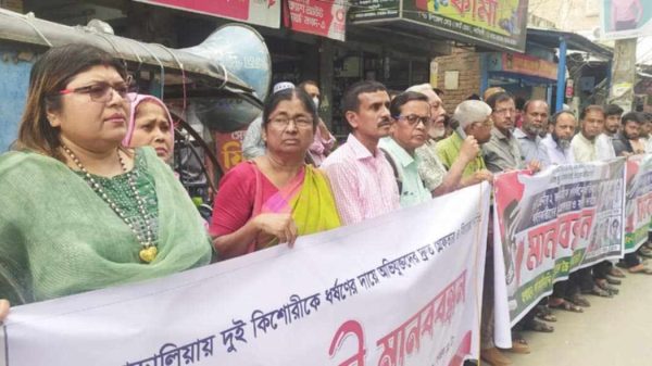 অরবিন্দ রায়, স্টাফ রিপোর্টারঃ নরসিংদীর রায়পুরা চর আড়ালিয়ার বাঘাইকান্দি গ্রামে দুই স্কুল ছাত্রী ধর্ষণকারীদের গ্রেফতার ও ফাঁসির দাবিতে সম্মিলিত সচেতন নাগরিক সমাজ শনিবার মানববন্ধন ও প্রতিবাদ সমাবেশ করেছে।