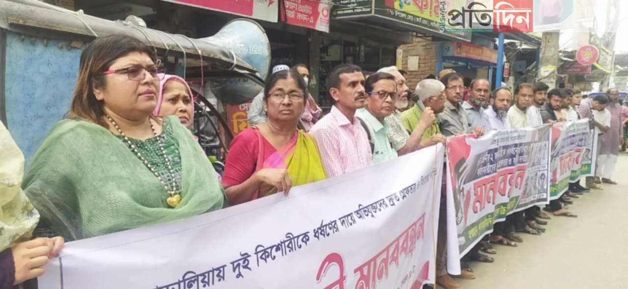নরসিংদী দুই ছাত্রী গণধর্ষণকারীদের গ্রেফতার ও ফাঁসির দাবিতে মানববন্ধন ও প্রতিবাদ সমাবেশ