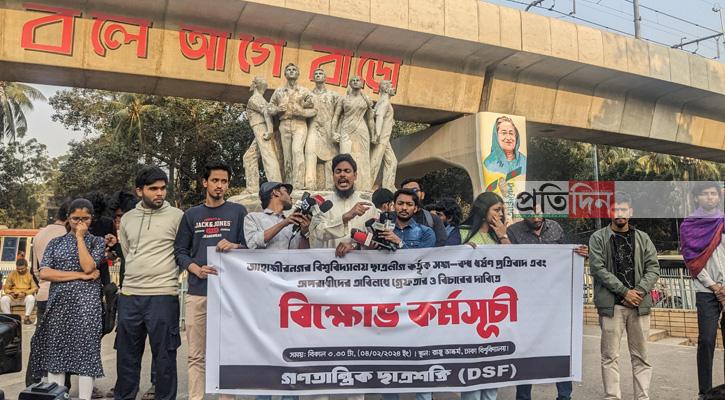 বিক্ষোভ সমাবেশে ছাত্রশক্তির কেন্দ্রীয় আহ্বায়ক আখতার হোসেন বলেন, জাবিতে যে ধর্ষণের ঘটনা, তা ফ্যাসিবাদী শক্তির বাই-প্রোডাক্ট। ২০১৮ সালের নির্বাচনে নোয়াখালীর সুবর্ণচরে এক নারীকে গণধর্ষণ করা হয়েছিল, বিচার হয়নি। সিলেটের এমসি কলেজেও একই ঘটনা। গতকাল যে কক্ষে ভুক্তভোগীর স্বামীকে বেঁধে রাখা হয়েছিল, সেটিও ছাত্রলীগের টর্চার সেল ছিল। তাদের পালাতে হলের প্রাধ্যক্ষ ও বিশ্ববিদ্যালয়ের প্রক্টর সহায়তা করেছেন।