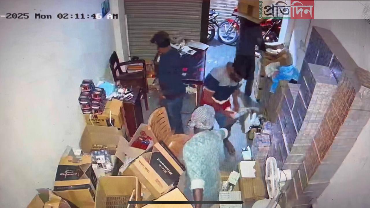 শাটার ভাঙার পর একের পর এক কার্টুন বের করতে থাকেন তারা।প্রায় এক মিনিট পর লাইট হাতে একজন ও আরেকজন নিরাপত্তারক্ষীকে এগিয়ে যেতে দেখা যায়। একই সময়ে দুইজন ব্যক্তি দ্রুত পিকআপে কার্টুন লোড করতে থাকেন।একপর্যায়ে ২টা ১৪ মিনিটের এলাকাবাসী ওই পিক-আপের দিকে এগিয়ে এলে দুর্বৃত্তরা দৌড়ে গাড়িতে উঠে পালিয়ে যায়। এ সময় পিক-আপে বিভিন্ন বয়সের অন্তত নয়জন দুর্বৃত্তকে উঠতে দেখা যায়।ভুক্তভোগী ব্যবসায়ী মুহাম্মদ নাসিম বলেন, আমাকে আমার এলাকার এক বন্ধু ফোন করে বলে, তোমার গোডাউনে মাল চুরি হইছে। ওরা উপস্থিত ছিল। গোডাউনে এসে দেখলাম, ৩০ পিস মাল গেছে। যার মূল্য ১৫ লাখ টাকার বেশি। আর ক্যাশে টাকা ছিল ৫ লাখ ৩২ হাজার ৯৩২ টাকা। এগুলো ক্ষয়ক্ষতি হয়েছে। ২টা ১০ মিনিটের দিকে ঢুকে তারা। তাদের সনাক্ত করতে পারিনি।