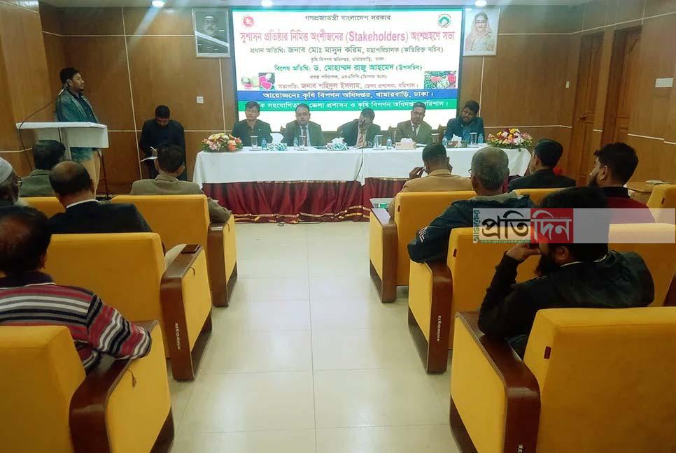 অতিরিক্ত জেলা প্রশাসক (সার্বিক) মনদীপ ঘরাই’র সভাপতিত্বে এবং কৃষি বিপণন অধিদপ্তরের সহকারি পরিচালক কিশোর কুমার সাহার সঞ্চালনায় সভায় বক্তব্য রাখেন বীজ প্রত্যয়ন এজেন্সির সহকারী বীজ প্রত্যয়ন কর্মকর্তা মো. জাকির হোসেন তালুকদার, কৃষি বিপণন অধিদপ্তরের উপ-পরিচালক একেএম মাহবুব আলম, জাতীয় ভোক্তা অধিকার সংরক্ষণ অধিদপ্তরের উপ-পরিচালক অপূর্ব অধিকারী, মৃত্তিকা সম্পদ উন্নয়ন ইন্সটিটিউটের ঊর্ধ্বতন বৈজ্ঞানিক কর্মকর্তা কাজী আমিনুল ইসলাম, কৃষি তথ্য সার্ভিসের কর্মকর্তা নাহিদ বিন রফিক, কৃষি উদ্যোক্তা রুবাইয়েত ইসলাম ও আমবাগান মালিক হিরণ হাজারী।