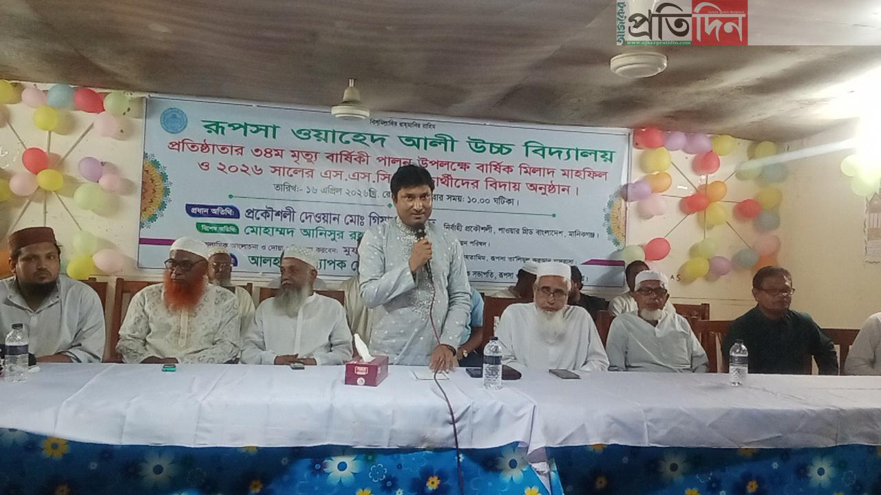 বৃহস্পতিবার (১৬ এপ্রিল) ১১.৩০ সময় বিদ্যালয় হল রুম আয়োজিত অনুষ্ঠানে প্রধান অতিথি প্রকৌশলী দেওয়ার মোঃ গিয়াস উদ্দিন বক্তব্যে তিনি বলেন আমি বিদায়ী পরীক্ষার্থীদের অভিনন্দন জানাই। আজ তোমরা এখান থেকে বিদায় নিলেও, শিক্ষা জীবনের নতুন দিগন্তে পা রাখছো।