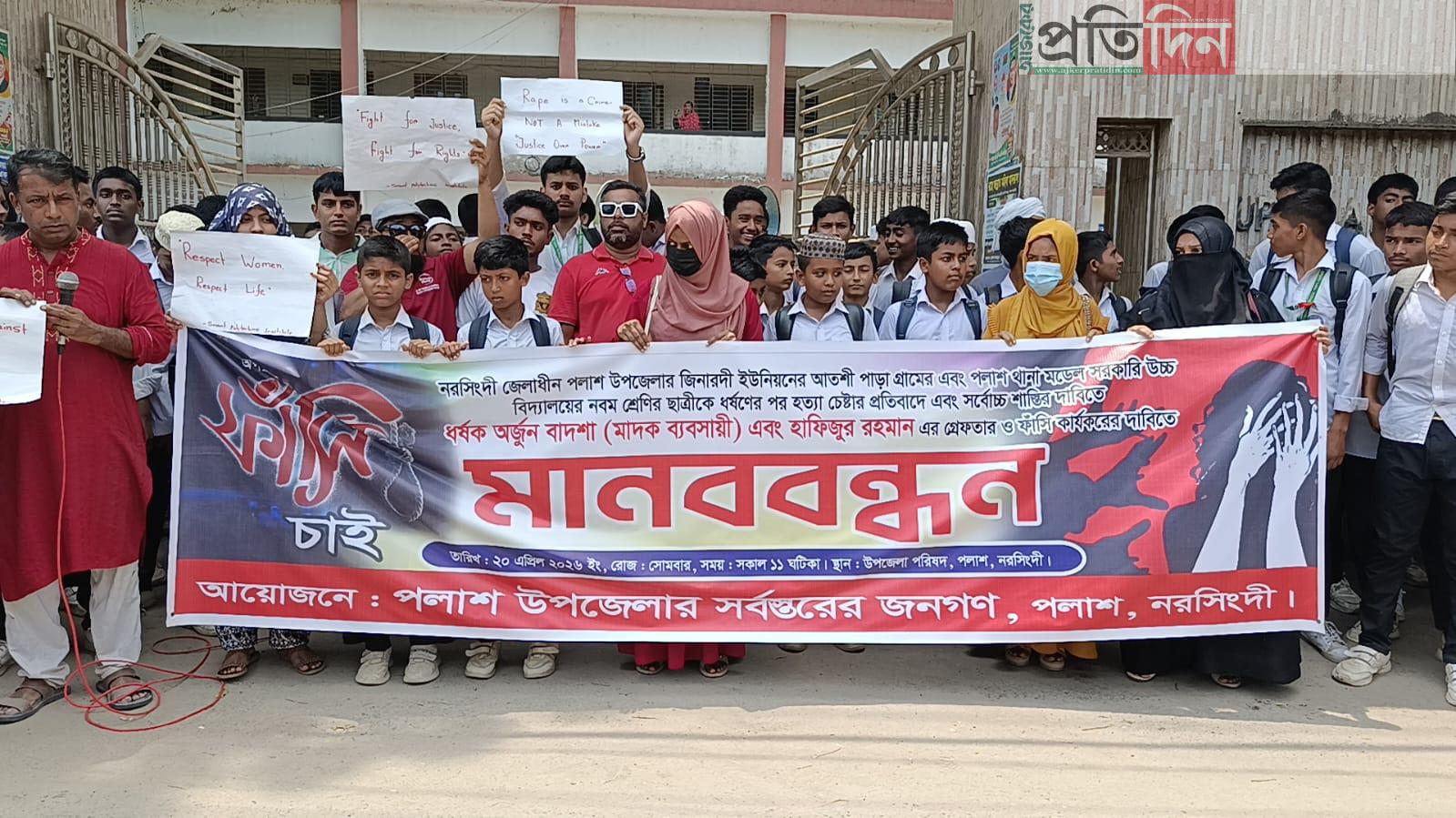 পলাশে শিক্ষার্থীর ধর্ষকদের দ্রুত গ্রেফতার ও শাস্তির দাবীতে মানববন্ধন অনুষ্ঠিত