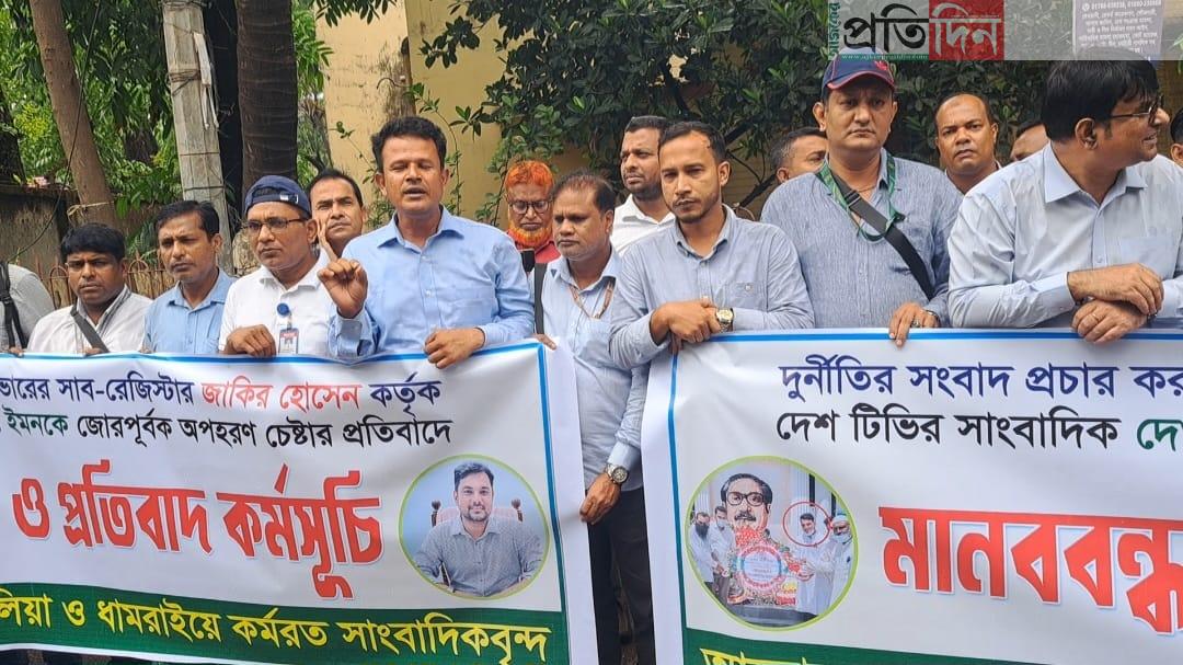 মানববন্ধন শেষে প্রতিবাদের অংশ হিসেবে এক ঘণ্টার ‘কলম বিরতি’ পালন করা হয়। এসময় বক্তারা বলেন, সাব-রেজিস্ট্রার জাকির হোসেনের দুর্নীতি নিয়ে সংবাদ প্রচারের জেরে দেশ টিভির স্থানীয় প্রতিনিধি দেওয়ান ইমনের ওপর হামলা ও তাকে জোরপূর্বক তুলে নেওয়ার চেষ্টা করা হয়েছে।