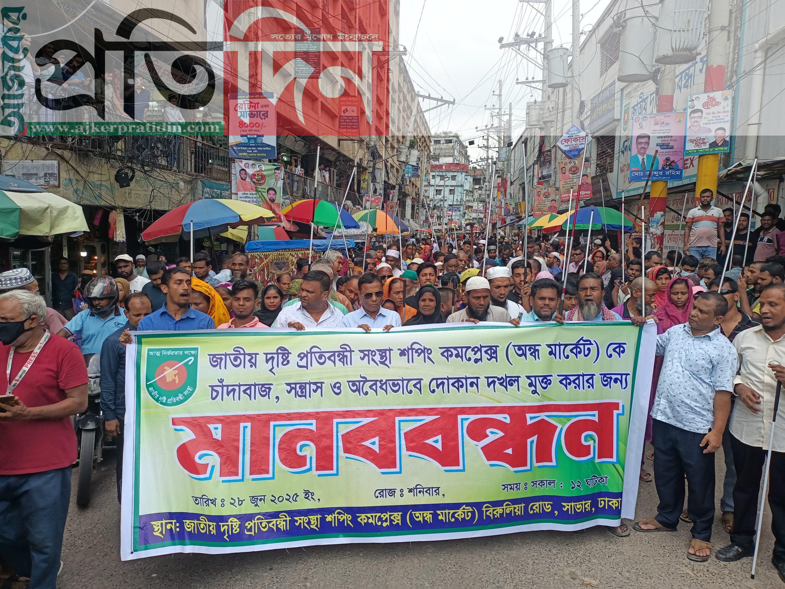 সাভারে সন্ত্রাসী ও চাঁদাবাজদের কবল থেকে মার্কেট রক্ষার দাবিতে দৃষ্টি প্রতিবন্ধীদের মানববন্ধন