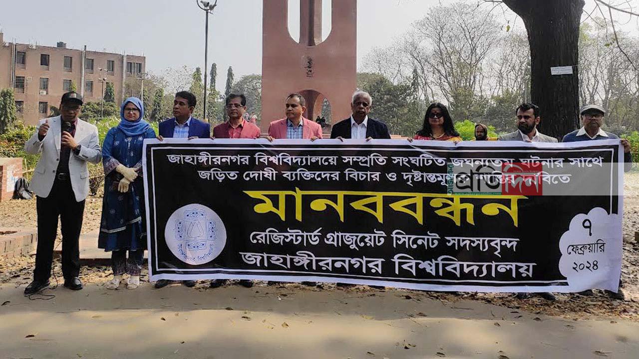 জাহাঙ্গীরনগর বিশ্ববিদ্যালয়ে (জাবি) গৃহবধূকে দলবদ্ধ ধর্ষণের ঘটনায় জড়িতদের বিচার ও দৃষ্টান্তমূলক শান্তি নিশ্চিত করার দাবিতে মানববন্ধন করেছেন বিশ্ববিদ্যালয়ের রেজিস্ট্রার গ্র্যাজুয়েট সিনেট সদস্যরা।