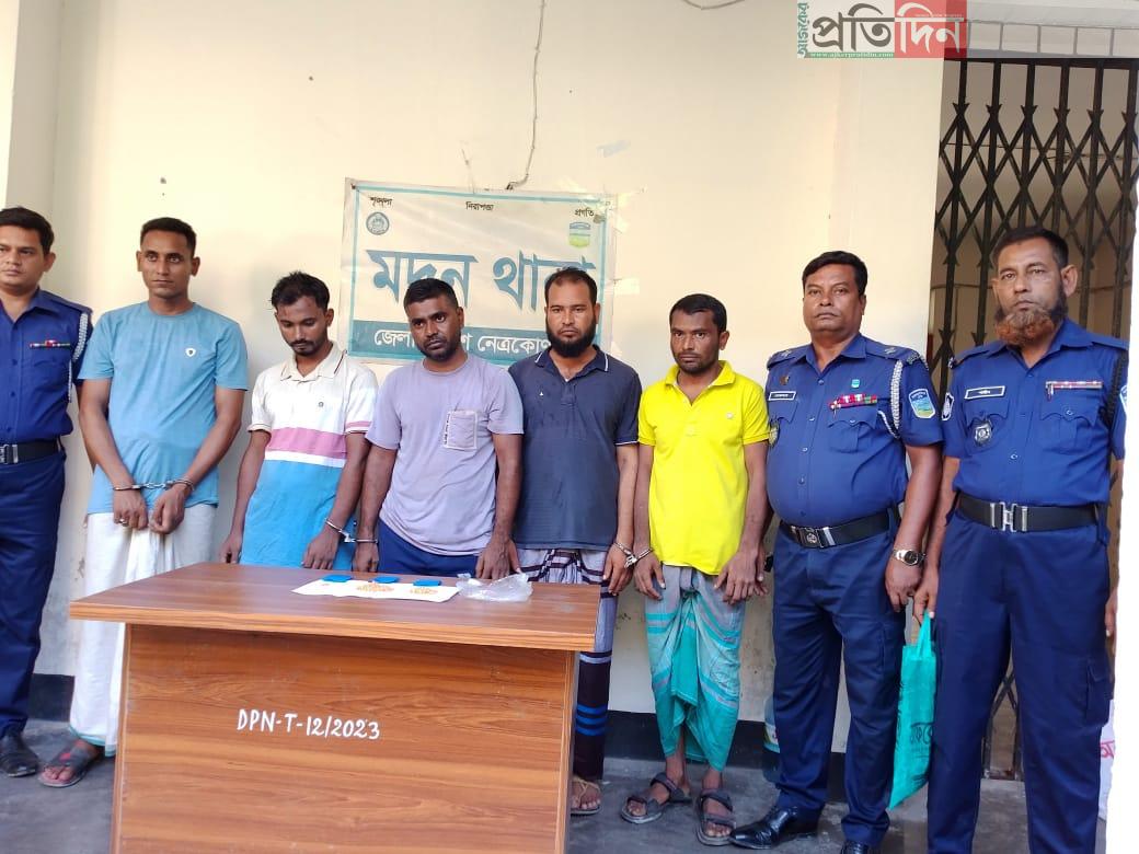 আটককৃতরা হলেন- মোঃ রুবেল মিয়া (৩২) মদন উত্তরপাড়া গ্রামের আব্দুল মাওলার ছেলে, মহিবুল (২৬) কদম কদমশ্রী গ্রামের আবুল মিয়ার ছেলে, হিরন মিয়া পরশখিলা ভাটিপাড়া গ্রামের ইসরাফিলের ছেলে, মিলন শেখ (৩২) তিয়শ্রী উত্তরপাড়া গ্রামের কহোজ মিয়ার ছেলে ও আনোয়ার হোসেন (২৮) বৃ -বড়িকান্দি গ্রামের মৃত ধনাই মিয়ার ছেলে।
