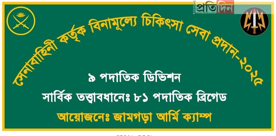 *বাংলাদেশ সেনাবাহিনী ৯ পদাতিক ডিভিশনের তত্ত্বাবধানে আগামী ২৯ অক্টোবর রোজ বুধবার সকাল ৯টা থেকে বিকেল ৪টা পর্যন্ত আশুলিয়ার, সামাজিক কনভেনশন হলে জামগড়া আর্মি ক্যাম্পের সার্বিক ব্যবস্থাপনায় বাংলাদেশ সেনাবাহিনী কর্তৃক বাইপাইল, ভাদাইল, নরসিংহপুর, আশুলিয়া, জিরাবো, ইয়ারপুর, বাগবাড়ি, তৈয়বপুর, ইউসুফ মার্কেট এবং কাশিমপুর, এলাকার দুস্থ ও অসহায় ব্যক্তিদের বিনামূল্যে চিকিৎসা সেবা ও ঔষধ প্রদান করা হবে। উল্লেখ্য যে, উক্ত দিনে মেডিসিন, শিশু, চক্ষু, চর্ম ও যৌন, স্ত্রীরোগ ও ধাত্রীবিদ্যা, নাক, কান ও গলার বিশেষজ্ঞগন চিকিৎসা সেবা প্রদান করবেন।