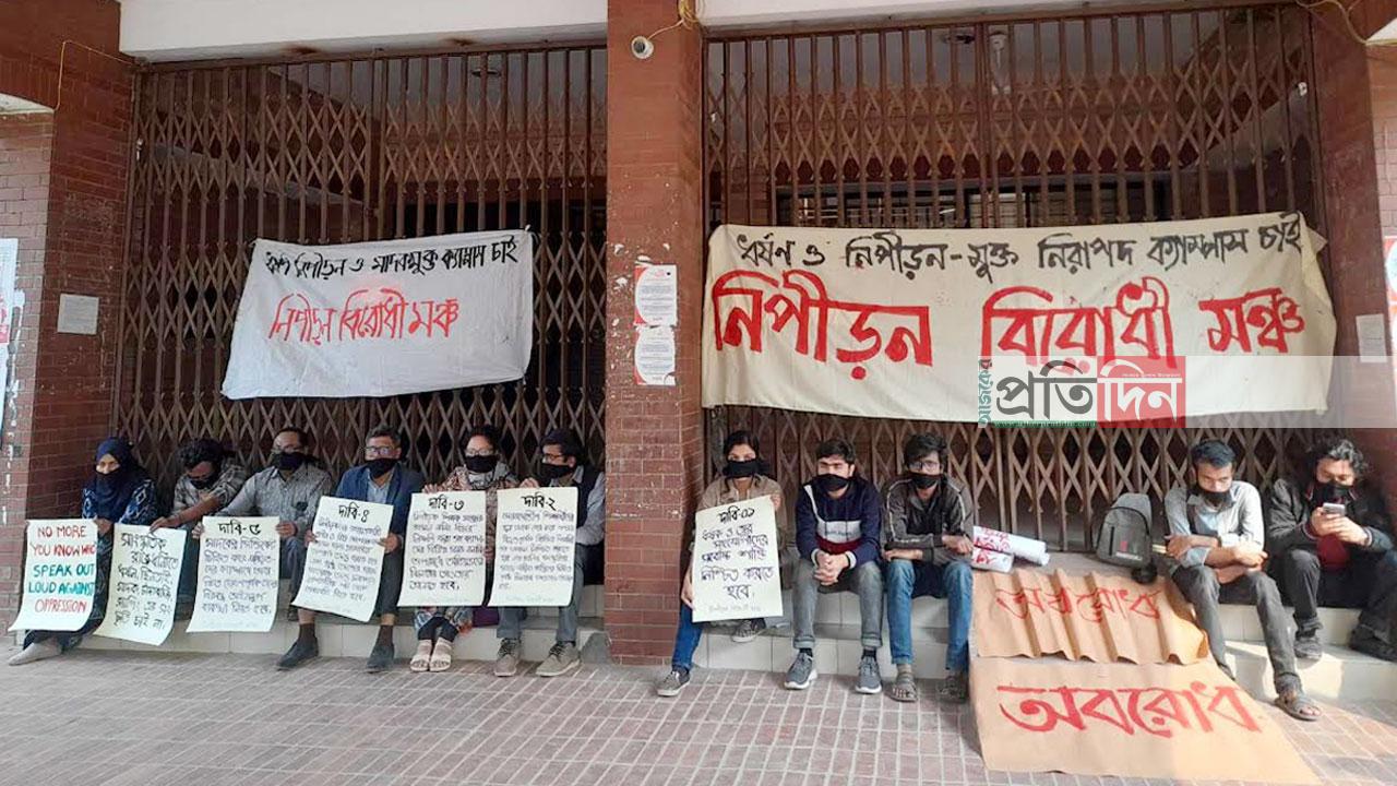 বৃহস্পতিবার (১৫ ফেব্রুয়ারি) ‘নিপীড়ন বিরোধী মঞ্চ’ ব্যানারে নতুন প্রশাসনিক ভবনের সামনে এ কর্মসূচি পালন করা হয়। সকাল ৯টা থেকে বেলা ১১টা পর্যন্ত অবরোধ কর্মসূচি চলে। এ সময় প্রধান ফটকসহ অন্যান্য ফটকও তালাবদ্ধ করে রাখেন আন্দোলনকারীরা।