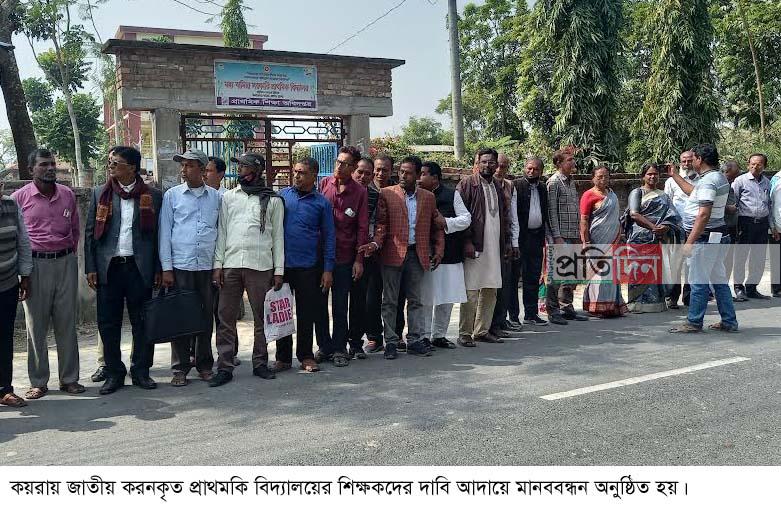 কয়রা উপজেলার জাতীয় করনকৃত প্রাথমিক বিদ্যালয়ের শিক্ষকদের টাইম স্কেল, ল্যামগ্রান্ড ও পদোন্নতি পাইবার দাবি জানিয়ে মানববন্ধন ও আলোচনা সভা অনুষ্ঠিত হয়।