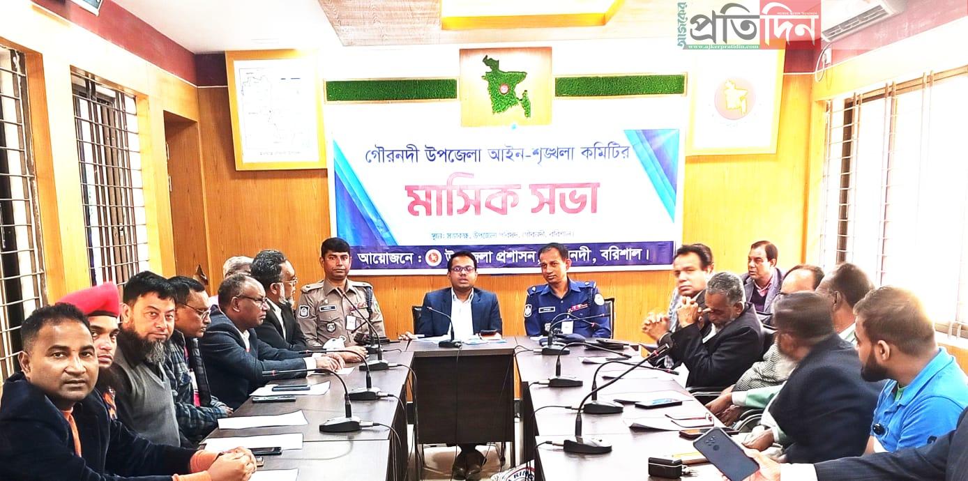 বরিশালের গৌরনদী উপজেলা আইনশৃঙ্খলা কমিটির মাসিক সভা অনুষ্ঠিত হয়েছে। উপজেলা প্রশাসনের আয়োজনে বুধবার সকালে উপজেলা পরিষদ হলরুমে সহকারী কমিশনার (ভূমি) মো. মেহেদী হাসানের সভাপতিত্বে আইনশৃঙ্খলা সভা অনুষ্ঠিত হয়। সভায় বক্তব্য রাখেন গৌরনদী হাইওয়ে থানার ওসি মো. শামীম শেখ, গৌরনদী মডেল থানার ওসি (তদন্ত) মো. মাহবুব আলম, উপজেলা কৃষি কর্মকর্তা সেকেন্দার শেখ, উপজেলা মাধ্যমিক শিক্ষা অফিসার আব্দুল জলিল, উপজেলা শিক্ষা অফিসার তাছলিমা বেগম, উপজেলা সমাজসেবা কর্মকর্তা সুশান্ত বালা, উপজেলা জাতীয় মহিলা সংস্থার কর্মকর্তা মোঃ শহিদুল ইসলাম গৌরনদী প্রেসক্লাবের আহবায়ক পৌর নাগরিক কমিটির সভাপতি সিনিয়র সাংবাদিক জহুরুল ইসলাম জহির, প্যানেল আহবায়ক মো. গিয়াস উদ্দিন মিয়া, খোন্দকার মনিরুজ্জামান মনির,গৌরনদী বিআরডিবির চেয়ারম্যান সোহানুর রহমান সোহাগ, সাংবাদিক মোল্লা ফারুক হাসান, লিটন খান,আবদুছ ছালেক মামুন সহ বিভিন্ন ইউনিয়ন পরিষদের চেয়ারম্যান ও বিভিন্ন দপ্তরের কর্মকর্তাবৃন্দ।