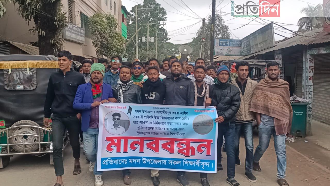 মদনে স্কুল ছাত্র শাওন হত্যার বিচারের দাবীতে মানববন্ধন