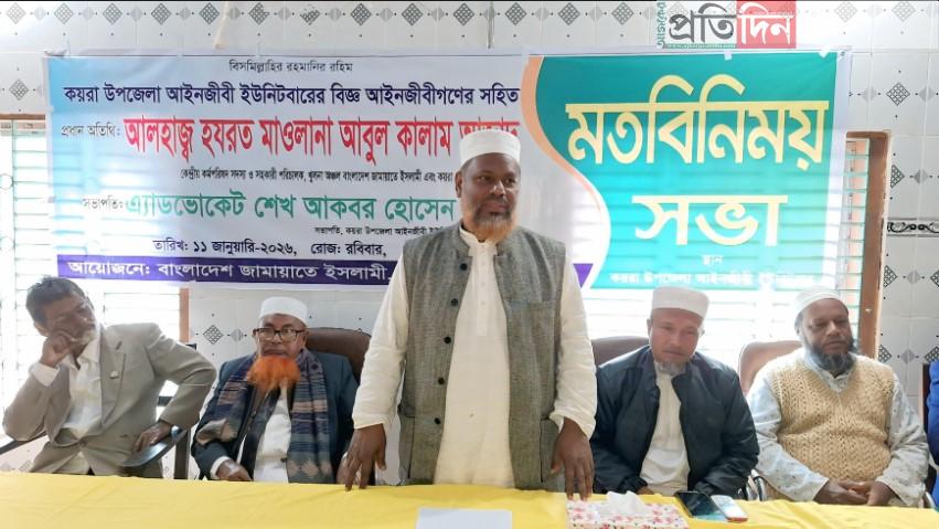 ১১ জানুয়ারী (রবিবার) সকাল ১০ টায় কয়রা উপজেলা আইনজীবী ইউনিট বার হলরুমে কয়রা উপজেলা আইনজীবীদের সাথে মতবিনিময় করেন কয়রা আইনজীবী সমিতির সভাপতি শেখ আকবর হোসেনের সভাপতিত্বে ও খুলনা জেলা ইউনিট বারের সদস্য এ্যাডভোকেট আবু বক্কর সিদ্দিকের সঞ্চালনায় মতবিনিময় সভায় প্রধান অতিথি মাওলানা আবুল কালাম আজাদ তিনি এসব কথা বলেন।