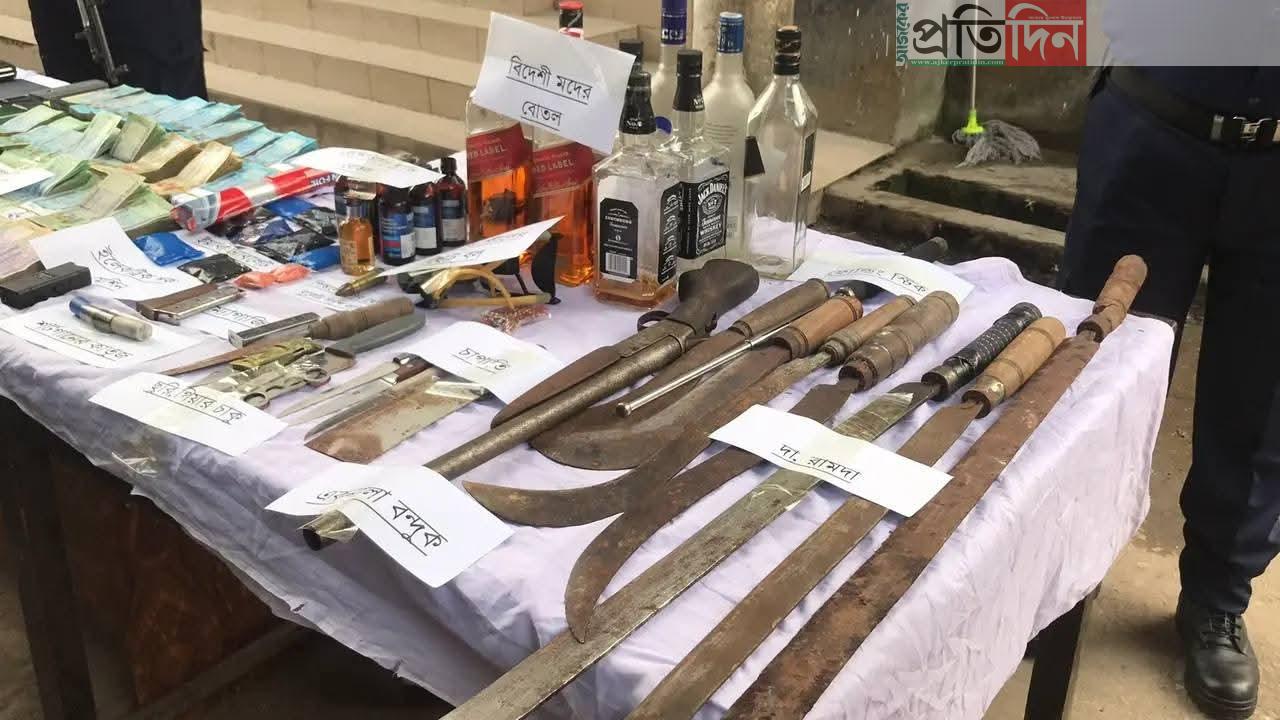 উদ্ধারকৃত মালামালের মধ্যে রয়েছে-১টি আগ্নেয়াস্ত্র (সাথে ২টি কার্তুজ), পিস্তলের ৩টি ম্যাগাজিন, ১ হাজার ৬০০ পিস ইয়াবা ট্যাবলেট, নগদ ১৫ লাখ ৪০ হাজার ১০০ টাকা, মোবাইল ফোন ১৭টি (১৩টি স্মার্টফোন, ৪টি বাটন), ২টি সামুরাই, ৬টি ফেনসিডিল, ৯টি বিদেশি মদের বোতল, ২টি নকল পিস্তল, ২টি রামদা ও ১টি ল্যাপটপ।