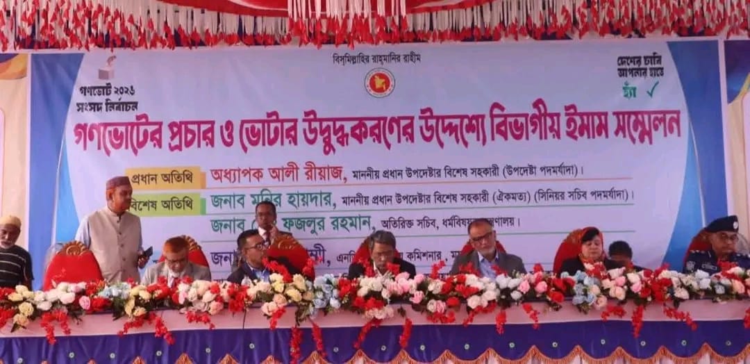বিভাগীয় কমিশনার ফারাহ শাম্মী এনডিসি এর সভাপতিত্বে অনুষ্ঠিত ইমাম সম্মেলনে প্রধান অতিথি হিসেবে উপস্থিত ছিলেন গণভোট সংক্রান্ত জনসচেতনতামূলক প্রচার কার্যক্রমের মুখ্য সমন্বয়ক ও প্রধান উপদেষ্টার বিশেষ সহকারী অধ্যাপক আলী রীয়াজ।