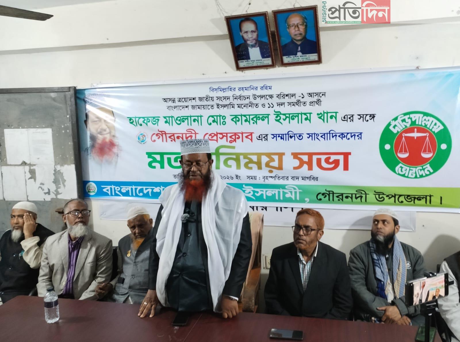 আসন্ন জাতীয় সংসদ নির্বাচনকে সামনে রেখে বরিশাল-১ (গৌরনদী-আগৈলঝাড়া) আসনে বাংলাদেশ জামায়াতে ইসলামী মনোনীত ও ১১ দল সমর্থিত প্রার্থী হাফেজ মাওলানা মোঃ কামরুল ইসলাম খানের সঙ্গে গৌরনদী প্রেসক্লাবের সাংবাদিকদের এক মতবিনিময় সভা অনুষ্ঠিত হয়েছে।