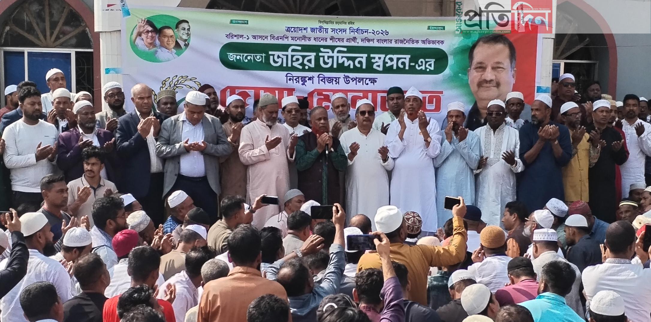 বরিশাল-১ (গৌরনদী–আগৈলঝাড়া) আসনে বিএনপির মনোনীত ধানের শীষ প্রতীকের প্রার্থী জহির উদ্দিন স্বপন-এর বিজয় উপলক্ষে দোয়া ও মোনাজাত মাহফিল অনুষ্ঠিত হয়েছে। শুক্রবার (আজ) বাদ জুমা সরকারি গৌরনদী কলেজ মসজিদের সামনে এ কর্মসূচির আয়োজন করা হয়।