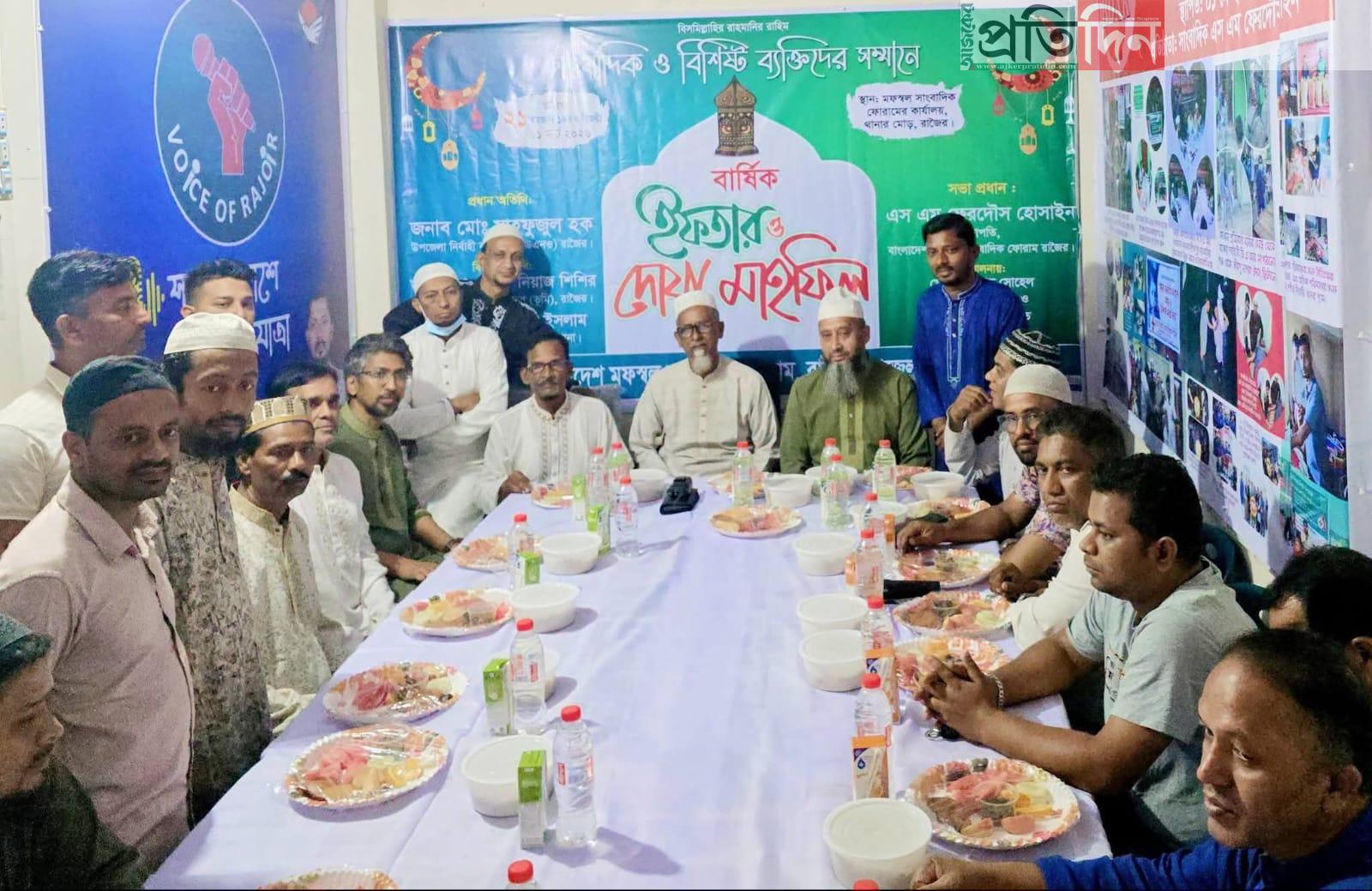 বাংলাদেশ মফস্বল সাংবাদিক ফোরামের রাজৈর উপজেলা সভাপতি দৈনিক জনকণ্ঠের রাজৈর প্রতিনিধি এস এম ফেরদৌস হোসাইনের সভাপতিত্বে ও সাধারণ সম্পাদক মেহেদী হাসান সোহেল এর সঞ্চালনায় ইফতারে ও দোয়া মাহফিলে প্রধান অতিথি হিসেবে উপস্থিত ছিলেন রাজৈর উপজেলা নির্বাহী কর্মকর্তা মোঃ মাহফুজুল হক।