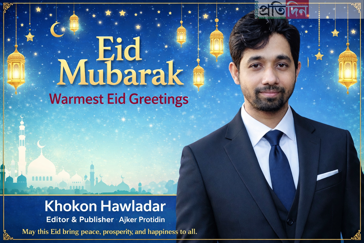 আজকের প্রতিদিন পত্রিকার সম্পাদক ও প্রকাশক খোকন হাওলাদার দেশের মানুষকে পবিত্র ঈদুল ফিতর উপলক্ষে আন্তরিক শুভেচ্ছা জানিয়েছেন।