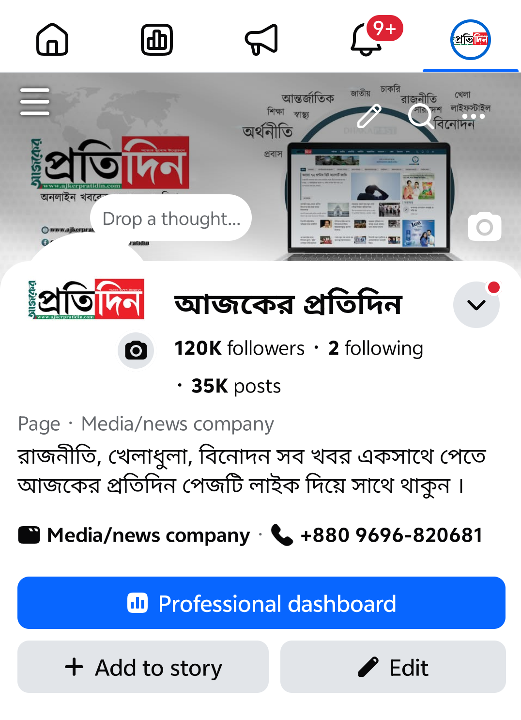 সামাজিক যোগাযোগমাধ্যমে ধারাবাহিক অগ্রযাত্রা অব্যাহত রেখে ‘আজকের প্রতিদিন’ ফেসবুক পেইজে অনুসারীর সংখ্যা ১ লাখ ২০ হাজারে পৌঁছেছে। এ অর্জনকে কেন্দ্র করে পেইজ সংশ্লিষ্টরা মহান আল্লাহর দরবারে শুকরিয়া জ্ঞাপন করেছেন।