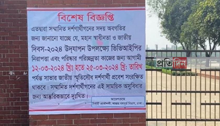 জাতীয় স্মৃতিসৌধে ২৫ মার্চ পর্যন্ত দর্শনার্থীদের প্রবেশ নিষেধ
