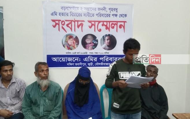 আমি রুলি বেগম, স্বামী মৃত, মির্জান আলী, স্থান-ভবানীপুর, থানা: জুড়ী, মৌলভীবাজার। আমার মেয়ে এমি আক্তার কে ২০১৯ সালে বড়ধামাইয়ের মোক্তার আলীর ছেলে জাবেদ উদ্দিনের নিকট বিবাহ দেই। এমির ২টি মেয়ে রয়েছে। তাদেরও বয়স যথাক্রমে জান্নাত ৪ বছর, জামিয়া আক্তার বয়স ১৭ মাস। বিয়ের কিছুদিন ভালো চললেও বিয়ের ৬ মাস পর থেকে এমির স্বামী এমিকে নানাভাবে নির্যাতন করা শুরু করে। প্রায় নিয়মিতই জাবেদ আমার মেয়েকে আমাদের নিকট থেকে অর্থ নেওয়ার জন্য চাপ সৃষ্টি করত। টাকা দিতে না পারলে আমার মেয়েকে মারধর করত এবং কোনো কোনো সময়ে প্রানে মারার হুমকিও দিত।