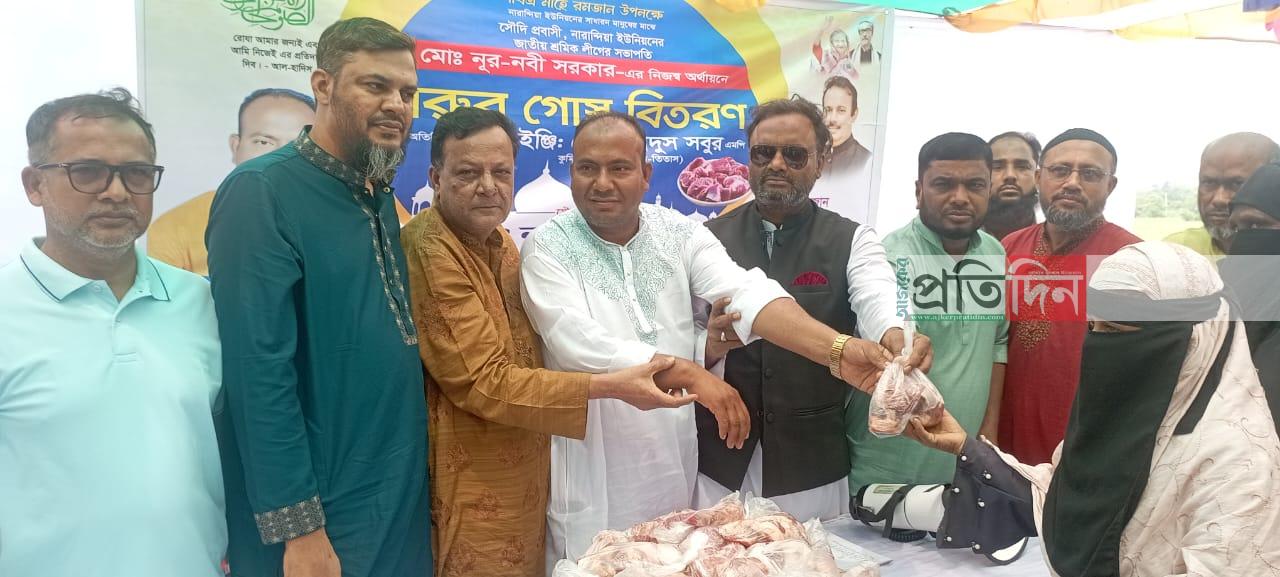 পবিত্র মাহে রমজান উপলক্ষ্যে গতকাল শনিবার সকাল ১১ টার দিকে উপজেলার নারান্দিয়া ইউনিয়নের কাচারি বাজারস্থ চকের বাড়িতে প্রায় ৪০০ জন মানুষের মধ্যে গরুর গোস্ত বিতরণ করা হয়।