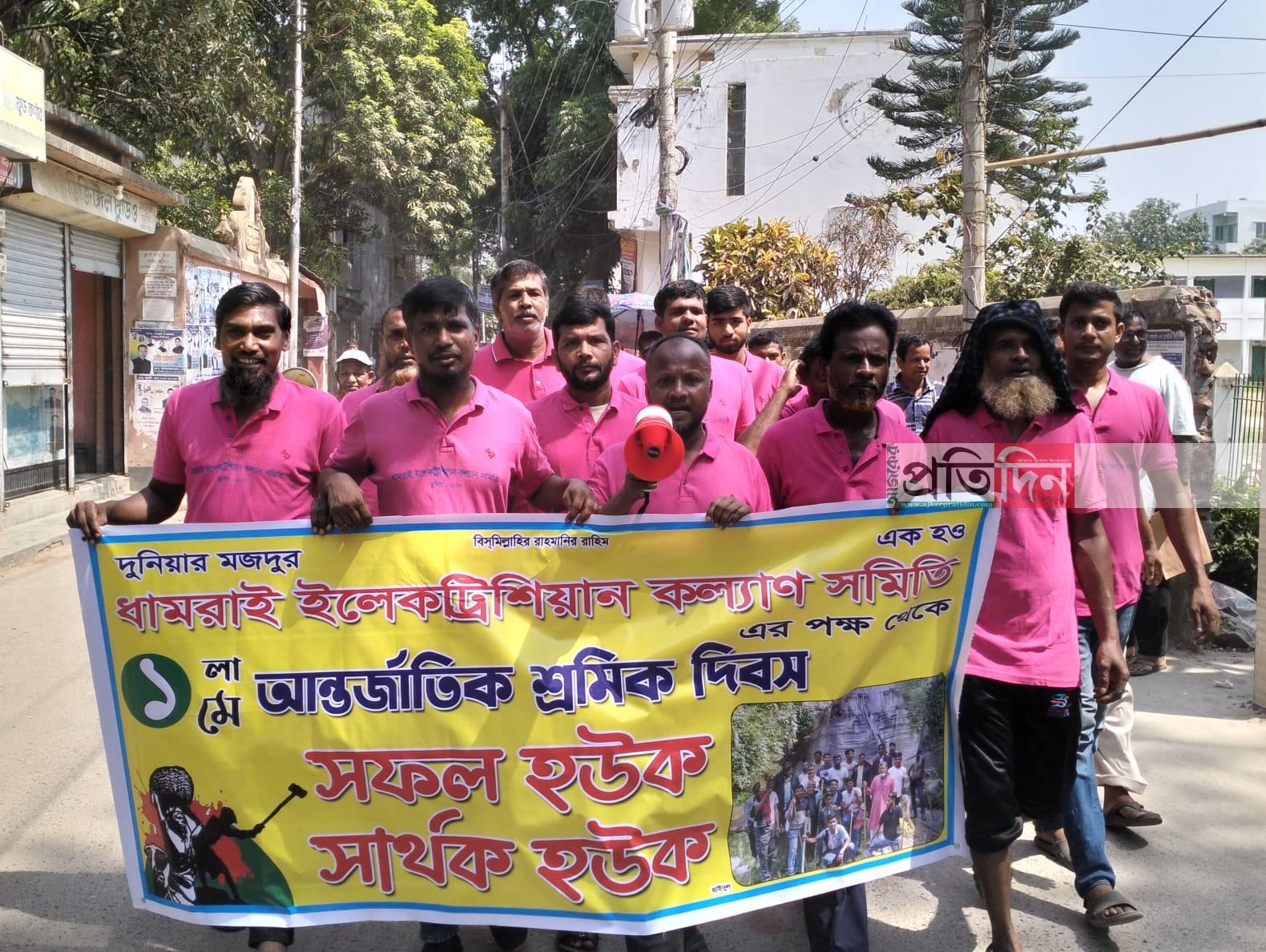 সংগঠনের শ্রমিকরা প্রথমে একটি র্যালি বের করে। সমিতির সভাপতি নূরে আলম সিদ্দিকের নেতৃত্বে র্যালিটি ধামরাই পৌরসভার বিভিন্ন সড়ক প্রদক্ষিণ করে ধামরাই যাত্রাবাড়ী মাঠে এসে সমাপ্তিসভা করে।এ সময় শ্রমিক নেতারা শ্রমিকের মজুরি বৈষম্য ও ন্যায্য মজুরি আদায়ের বিভিন্ন বক্তব্য দেন।এসময় উপস্থিত ছিলেন,উপজেলা ইলেকট্রিশিয়ান কল্যাণ সমিতির সহ-সভাপতি সাইদুর রেজা, সাধারণ সম্পাদক ওসমান গনি, সহ-সাধারণ সম্পাদক শহিদুল ইসলাম, যুগ্মসাধারণ সম্পাদক ফয়সাল খান, সাংগঠনিক সম্পাদক মাহবুব লাল চান, দপ্তর সম্পাদক রাফিজুর ইসলাম, অর্থ সম্পাদক হযরত আলী, বিনোদন মুলক সম্পাদক আশুতোষ সহ উক্ত সমিতির সকল সদস্য বৃন্দ।