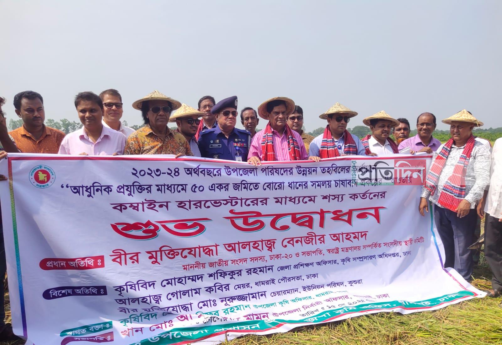 সম্রাট আলাউদ্দিন, ধামরাই (ঢাকা) : ঢাকার ধামরাইয়ে প্রণোদনা কর্মসূচির আওতায় ৫০ একর জমিতে সমলয়ে চাষাবাদের ফসল কাটা উদ্বোধন করেন ঢাকা জেলা আওয়ামী লীগের সভাপতি ও স্বরাষ্ট্র মন্ত্রণালয় সম্পর্কিত সংসদীয় স্থায়ী কমিটির সভাপতি স্থানীয় সাংসদ বীর মুক্তিযোদ্ধা বেনজীর আহমদ।