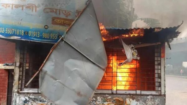 রবিবার বিকাল ৪টা ২০ মিনিটের দিকে কালশী মোড়ে অবস্থিত ট্রাফিক পুলিশের বক্সে আগুন দেয় আন্দোলনকারীরা।