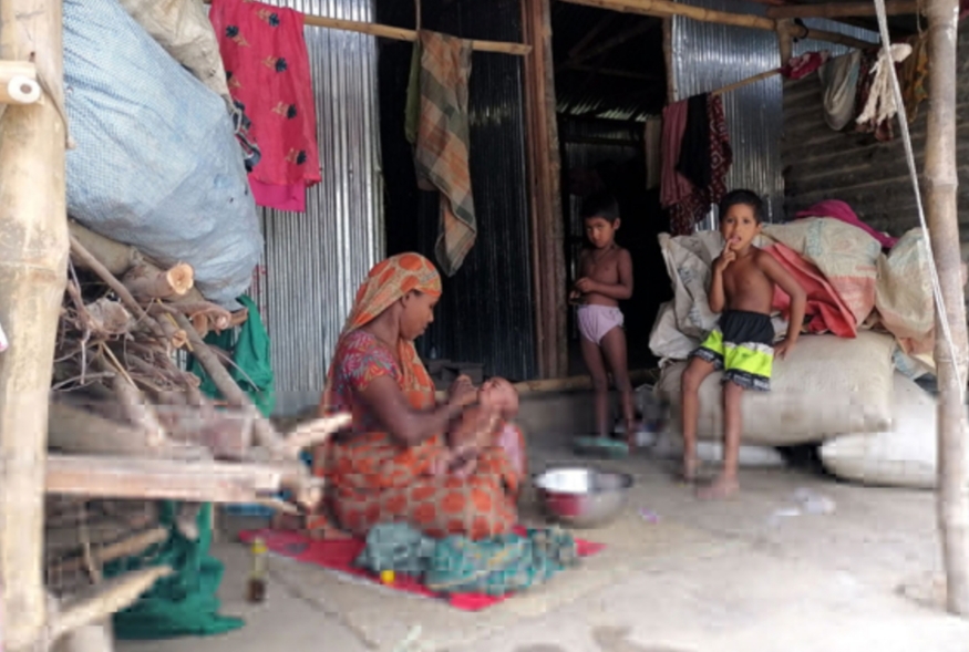 জঙ্গলে ঘেরা খালের ধারে নড়বড়ে বাড়িতে ৬ সন্তান নিয়ে বসবাস রাবেয়া খাতুনের। বাড়িতে প্রবেশের রাস্তা নেই। নেই বাড়িতে বিদ্যুৎ সযোগ। অনিরাপত্তায় বসবাস। একে একে ছয় মেয়ে সন্তানের পর এক ছেলে সন্তান যেন এই দুঃখি পরিবারের সব কষ্ট ভুলিয়ে দিয়েছে। ঝিনাইদহ সদর উপজেলার চন্ডিপুর গ্রামের হতদরিদ্র এই পরিবারের বসবাস। স্বামী শামসুল ইসলামের কিছুই নেই। পিতার দেওয়া ভিটেবাড়িতে ৭ সন্তান নিয়ে থাকেন রাবেয়া খাতুন। অতি কষ্টের সংসার তার। প্রায় দিন ঘরে খাবার থাকে না। ৭ সন্তানের মুখে খাবার তুলে দিতে হিমশিম খান দিনমজুর শামসুল। সকালে কাধে গামছা, হাতে দা নিয়ে গ্রামে গ্রামে ঘুরে নারকেল গাছ সাফ করেন। কোন দিন কাজ হয় আবার কোন দিন হয় না। এদিকে স্ত্রী রাবেয়া খাতুন পিতার বাড়িতেই বাচ্চাকাচ্চা সামলান। কখনো সন্তানের মুখে দুমুঠো ভাত তুলে দিতে পরের বাড়িতে ঝি এর কাজ করেন। রাবেয়া খাতুন জানান, আগে লক্ষিপুর আবাসন প্রকল্পের ঘরে বসবাস করতেন। এখন আর করেন না। এদিকে আম্ফান ঝড়ে তাদের বসবাস করার একমাত্র ঘরটি ভেঙ্গে গেছে। সন্তান নিয়ে নিজ ঘরে বসবাস আর বেঁচে থাকার লড়াই করতে করতে পরিবারটি এখন ক্লান্ত। তাদের দূরাবস্থার জানতে পেরে স্বেচ্ছাসেবী সংগঠন গান্না ইউনিয়ন বিচিত্রা রাবেয়ার দুগ্ধপোষ্য শিশুকে প্রয়োজনীয় ওষুধ ও খাবার পৌছে দিয়েছে। তবে এই সহায়তা পরিবারটির জন্য খবুই অপ্রতুল। বেঁচে থাকার জন্য তাদের সরকারী সহায়তা প্রয়োজন। রাবেয়া খাতুন জানান, “আমাগের ঘড়ডা যদি কেও ভাল করে দিত, আর কিছু নগদ টাকা পাইতাম তবে ৭ সন্তান নিয়ে বাঁচতে পারতাম। এ ব্যাপারে গান্না ইউনিয়নের চেয়ারম্যান নাছির উদ্দীন মালিথা জানান, এমন পরিবারের খোঁজ আমাকে কেও দেয়নি। কারণ আমি গান্না ইউনিয়নের প্রতিটি অসহায় দুস্থ পরিবারকে সরকারী কার্ড করে দিয়েছি। তিনি পরিবারটি খুজে বের করে আর্থিক সহায়তা করবেন বলে জানান।
