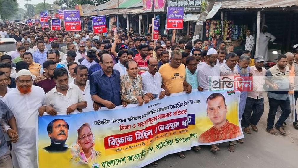 রবিবার (৯ জুন) বেলা ১১টার দিকে আটঘরিয়া উপজেলা আওয়ামী লীগের কার্যালয় থেকে একটি বিক্ষোভ মিছিল বের করেন নেতাকর্মীরা। মিছিলটি আটঘরিয়া বাজার হয়ে থানার সামনে দিয়ে প্রধান প্রধান সড়ক প্রদক্ষিণ করে আবার বাজার মোড়ে গিয়ে শেষ হয়। এ সময় টায়ার জ্বালিয়ে পাবনা-চাটমোহর সড়ক অবরোধ করেন নেতাকর্মীরা। সেখানে সংক্ষিপ্ত সমাবেশে উপজেলা আওয়ামী লীগের নেতৃবৃন্দ বক্তব্য রাখেন।