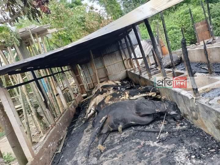 আগুনের টের পেয়ে রশি কেটে দিলে একটি গরু ছুটে যায়। কিন্তু মুহূর্তের মধ্যে আগুনের লেলিহান শিখা ছড়িয়ে পড়লে খামারে থাকা বাকি ১৩ টি গর পুড়ে যায়।এসময় আগুন দ্রুত ছড়িয়ে পড়লে পাশের খামারের আরো ৩৫০০ টি মুরগী মারা যায়।খামারের মালিক মিলন মুন্সি জানান, গত বছর গরুগুলো ক্রয় করেছি।