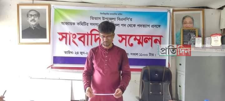 কুমিল্লার তিতাস উপজেলা বিএনপির আহবায়ক কমিটির সদস্য পদ থেকে পদত্যাগ করেছেন তিতাস প্রেস ক্লাবের ভারপ্রাপ্ত সভাপতি মো.কবির হোসেন।তিনি গতকাল সোমবার সকালে তিতাস প্রেস ক্লাব মিলনায়তনে এক সাংবাদিক সম্মেলনের মাধ্যমে বিএনপি থেকে পদত্যাগের আনুষ্ঠানিক ঘোষণা দেন।